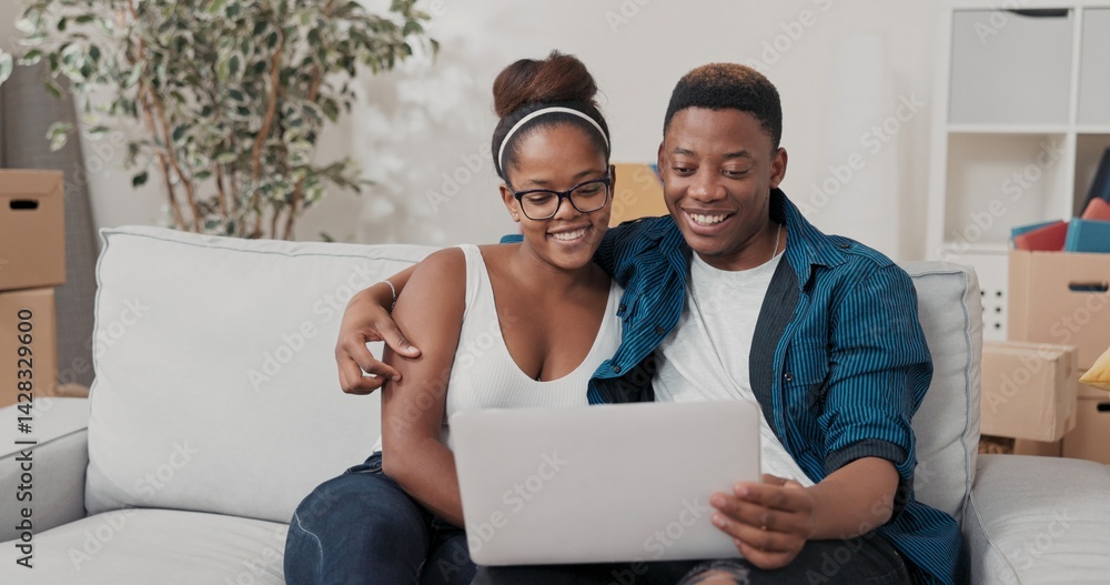 A cheerful couple sits on the sofa with a laptop, exploring interior design ideas. They giggle and share fun moments while choosing furnishings for their new apartment.