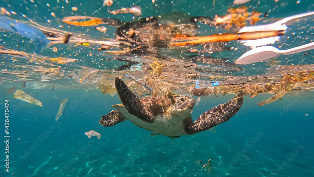 Closeup of sea turtle swimming through plastic trash and rubbish debris polluting the ocean