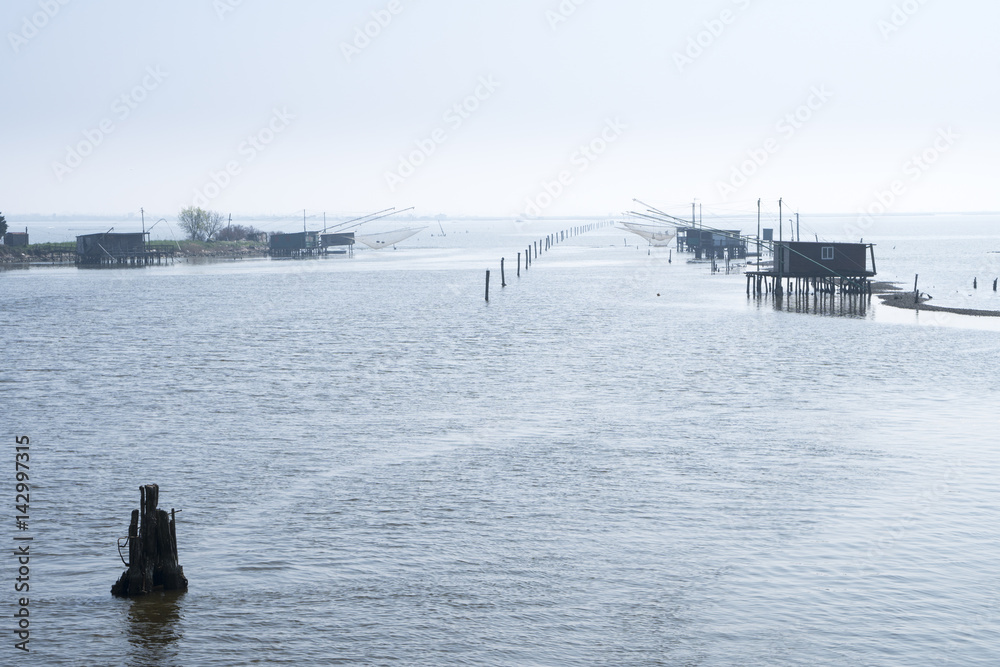 Fishing houses in the lagoon of Comacchio, Italy