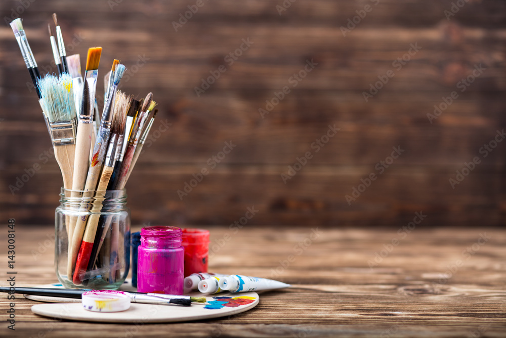 Artist's workshop. Top view of paintbrushes palette and acrylic paints with white canvas. Set of brushes and oil paints. Art picture with copy space and for add text.Items for children's creativity