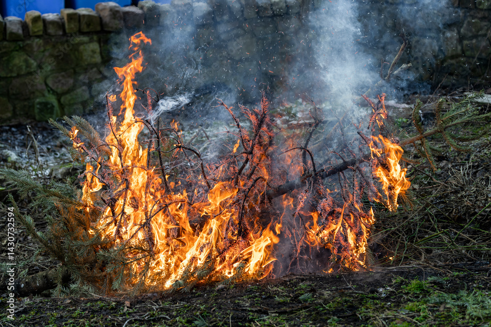 Norway Spruce Tree Christmas Tree Burning on Winter Garden Bonfire After the Festive Holidays