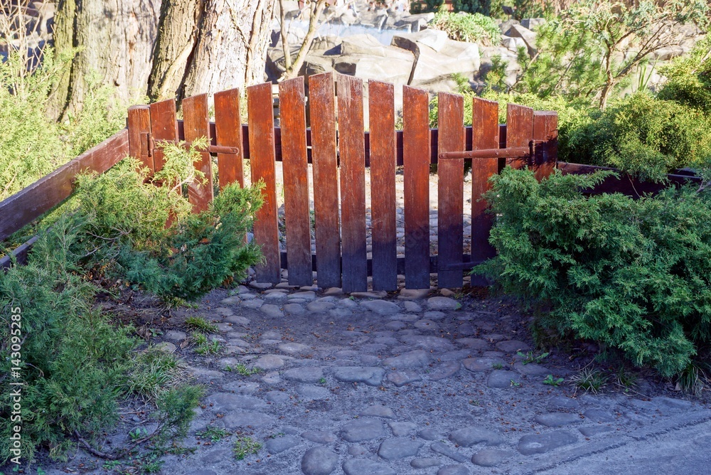 Маленькая деревянная калитка среди кустов и растений
