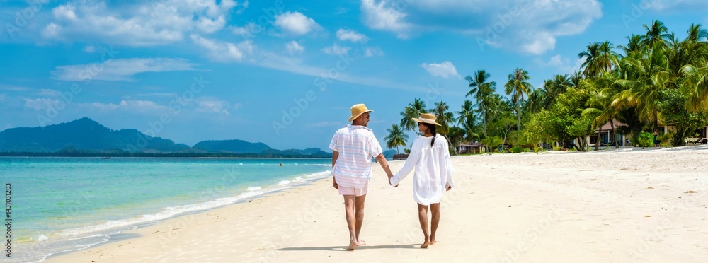 Two young Caucasian men and a Thai Asian woman walk hand in hand on the sandy shores of Koh Mook in Thailand, surrounded by lush palm trees and a clear blue sky, radiating joy and connection.
