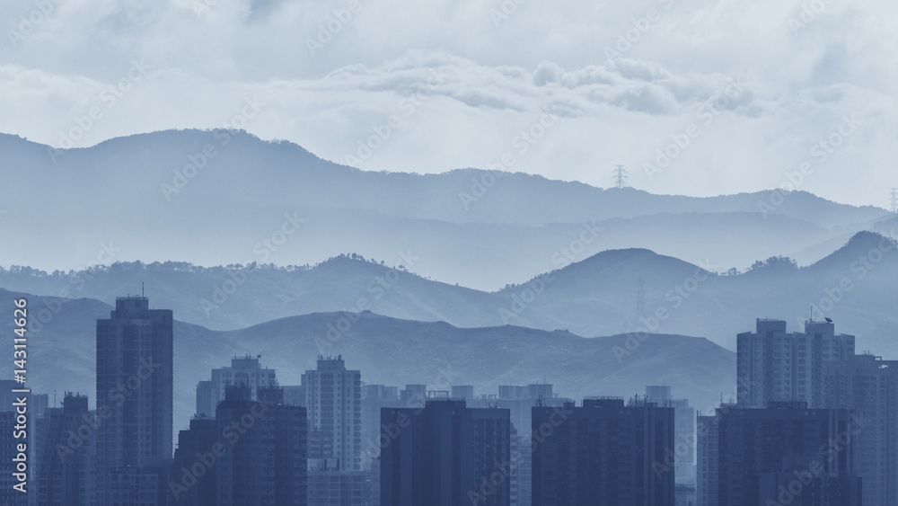 silhouette city skyline and mountain. landscape of Hong Kong at dawn