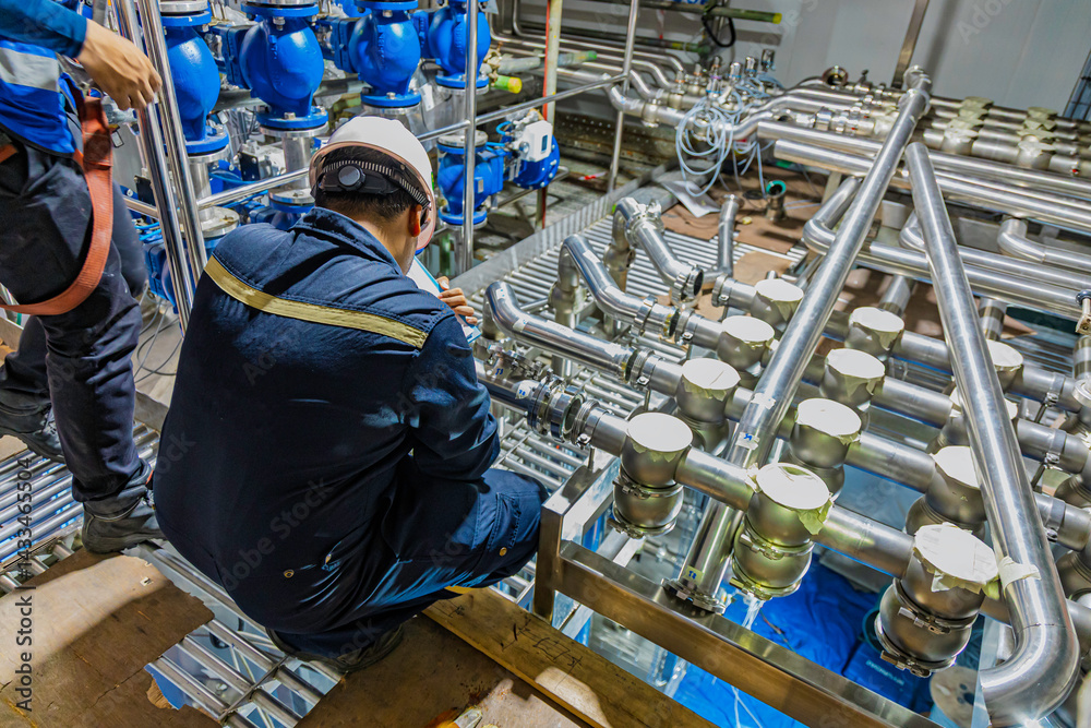 Male work inspection process stainless steel pipe stainless with pressure meter in equipment tank facility for drink cellar at the with vertical stainless valve