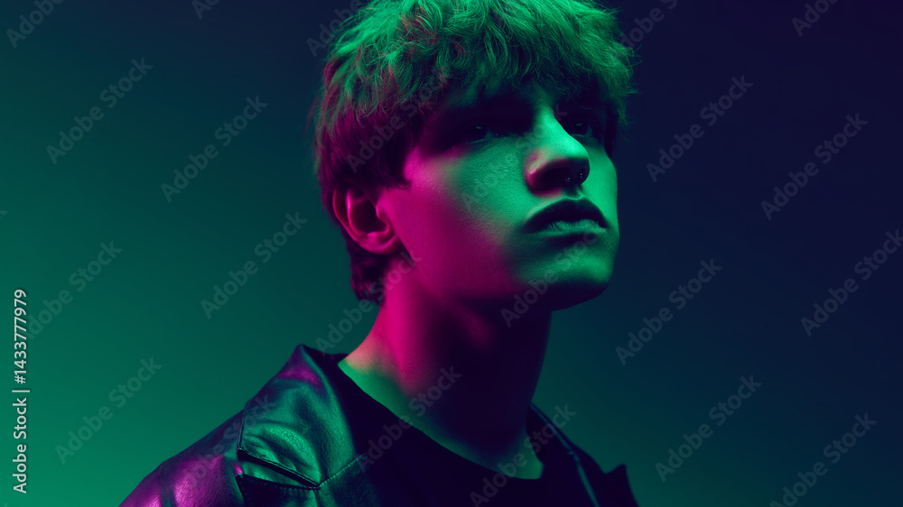 Dramatic close-up portrait of young man staring upward with intense eyes under green and fuchsia glow in cinematic lighting against gradient background. Concept of emotions, self-expression, beauty.