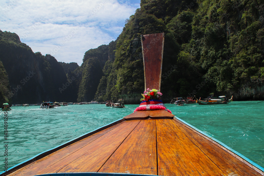 A point-of-view shot from a longtail boat, focusing on the iconic boat tail while beautiful limestone cliffs rise in the background.