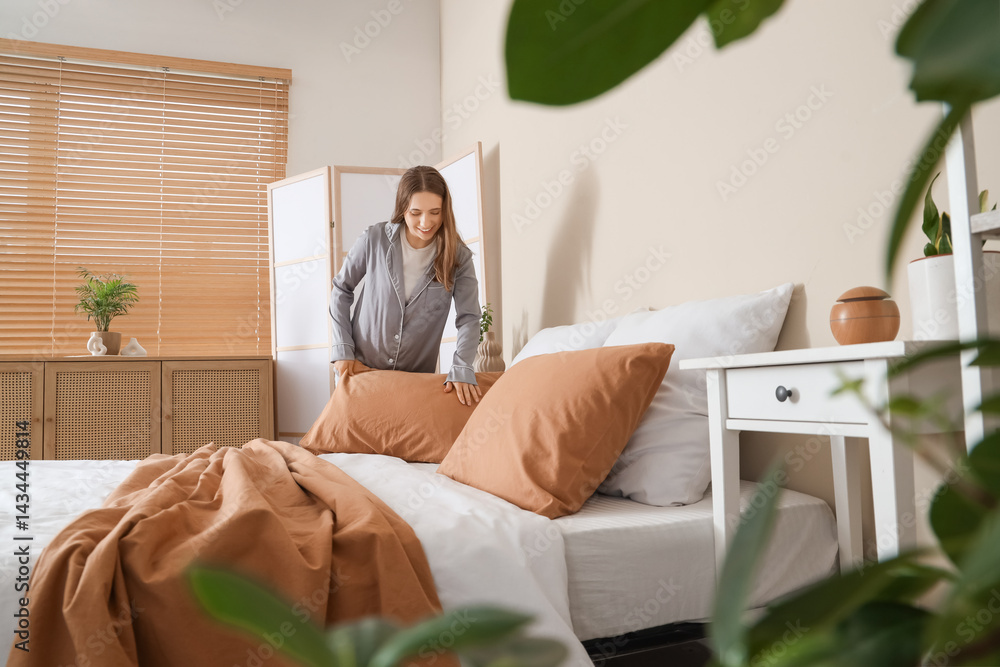 Pretty young woman making bed in stylish bedroom