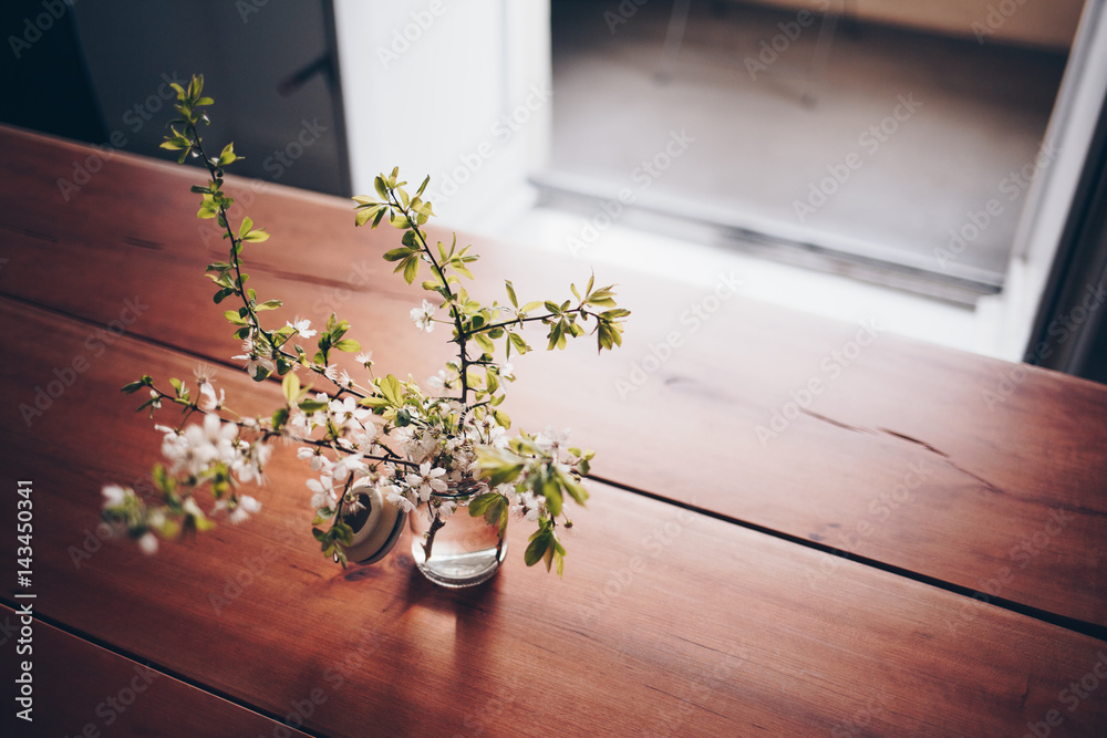 Weiße Blüten im Glas auf einem Kirschholz Tisch
