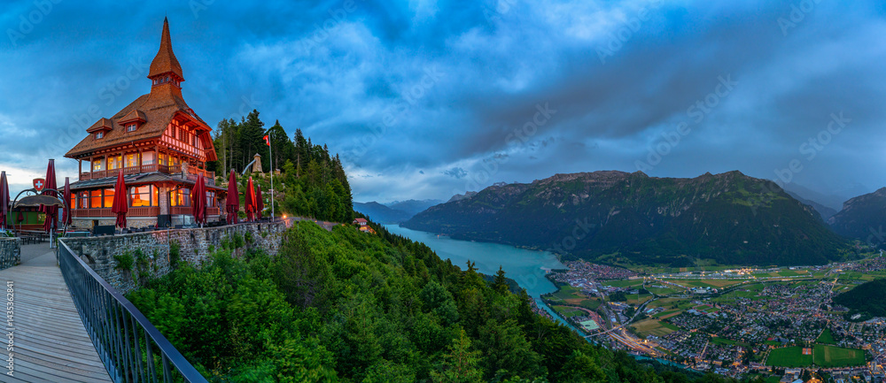 Panorama of Lake Brienz, Interlaken, and the surrounding Swiss Alps from Harder Kulm in Switzerland, with dramatic clouds and lush green valleys.
