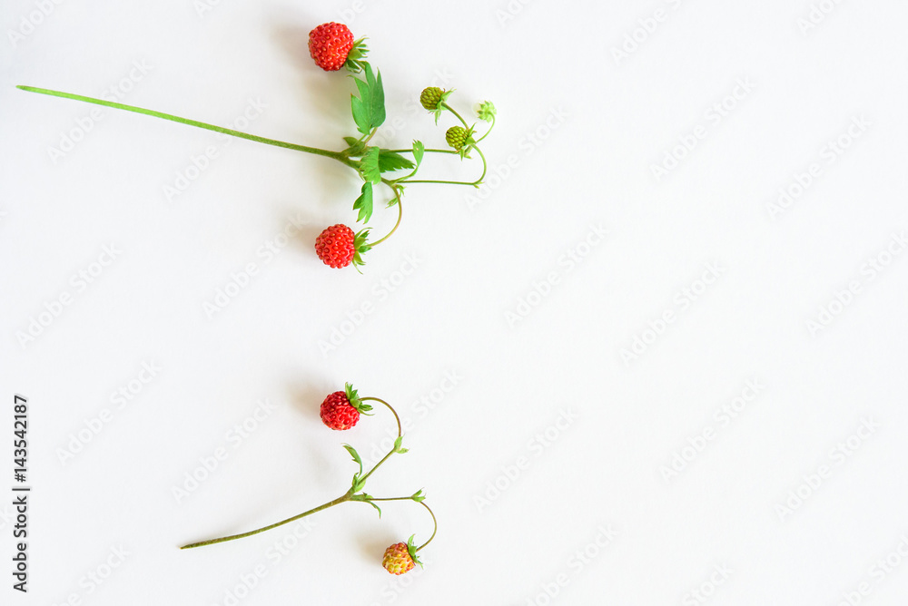 top view of strawberry fruits on bright dual blue and pink color paper background with copy space for text, wild summer health concept