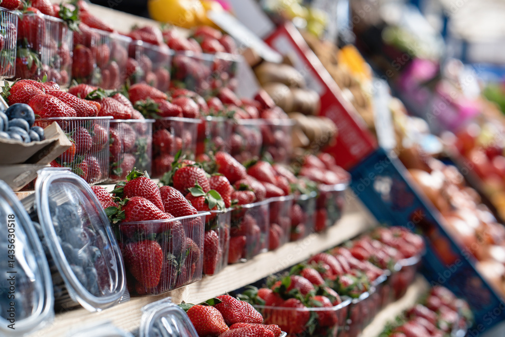 Close-up of ripe strawberries for sale on market stall. Fresh strawberries in plastic cups displayed at a street market stall