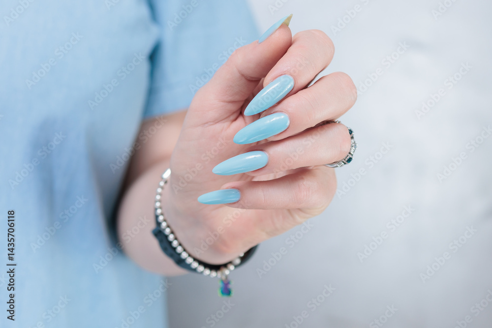 Woman's beautiful hand with long nails and light baby blue manicure