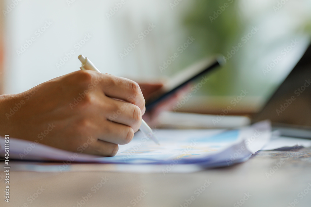Captured in the image is a hand gripping a pen, directing attention to a sheet summarizing the monthly KPI performance review.