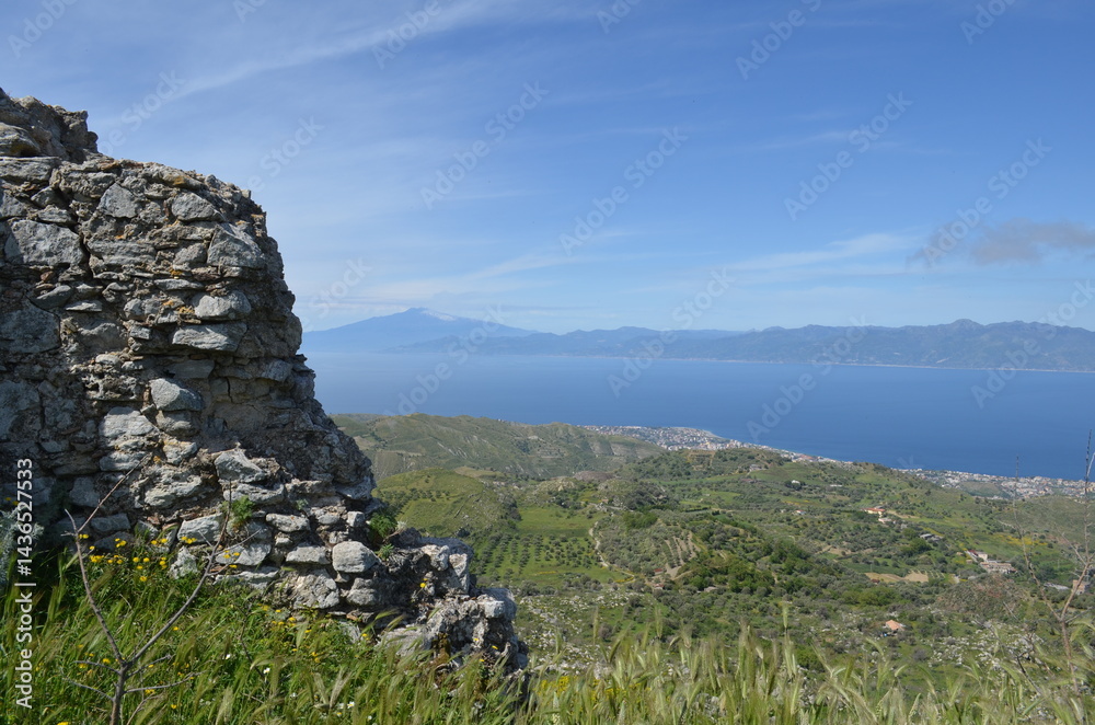 Veduta sullo Stretto di Messina (Vulcano Etna) dal Castello Santo Niceto Motta San Giovanni Reggio Calabria