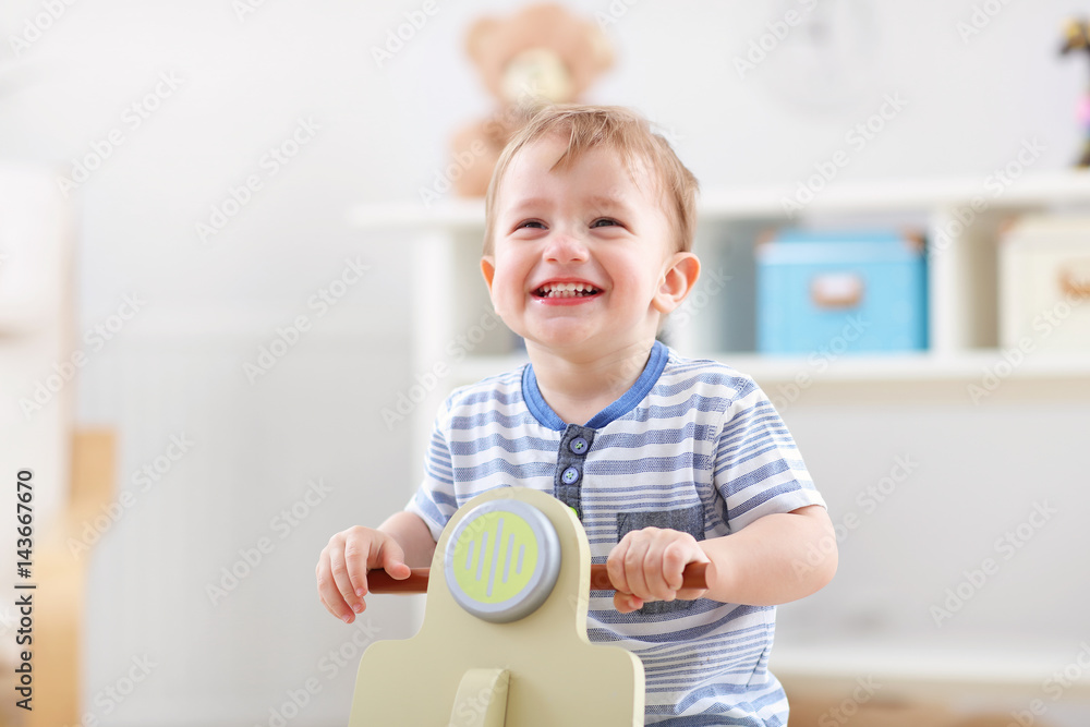 Cheerful baby boy swinging on a rocking chair in the shape of a scooter