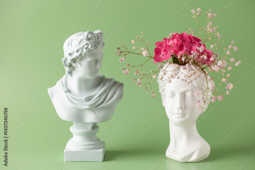 Creative art concept plaster head ancient sculpture with hair fresh flowers gypsophila and hydrangea on green background. Copy space