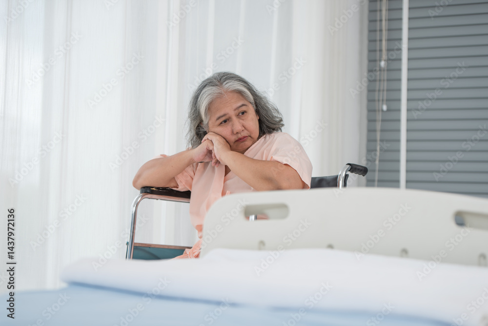 Depressed senior Asian woman patient in hospital sitting in wheelchair by the window, upset disabled patient thinking and looking out window, feeling lonely, nostalgia and melancholy