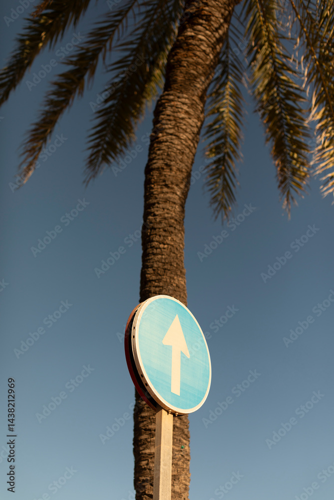 Direction road sign superimposed on the trunk of a palm tree, seems to point towards the blue sky of sunset, Spain