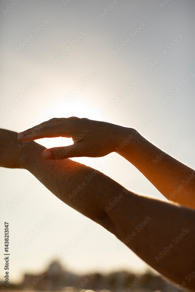 The silhouette of a young woman's hands, seem to dance as they caress each other under the rays of the afternoon sun, Mediterranean, Spain
