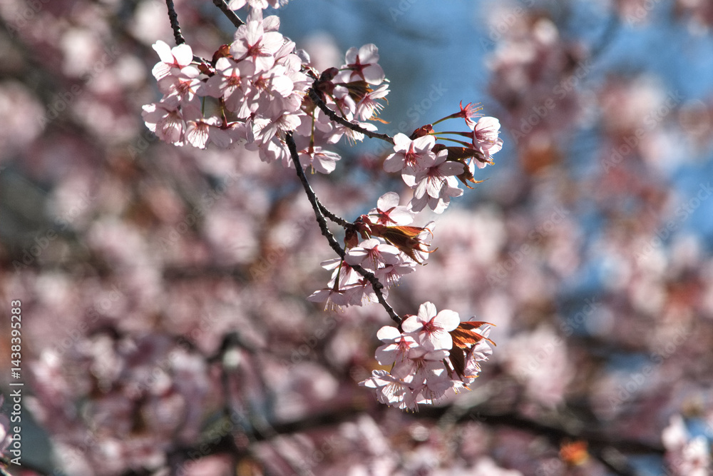 Spring red cherry blossoms in the park. Beautiful cherry blossoms on a sunny day