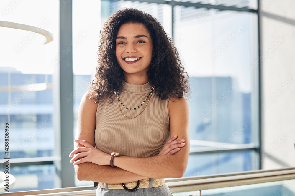 Woman, portrait and happy in office with arms crossed, fashion mogul and pride with entrepreneur. Clothing design, company and confident for career in bright workplace, smile and female boss