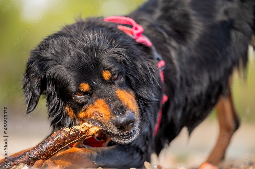 Hovawart Dog Biting and Chewing a Stick Outdoors. Playful Dog on Beach by Lake in Switzerland.