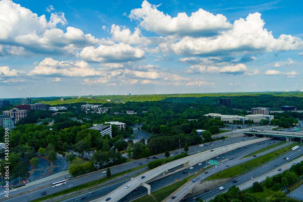 Aerial shot of cars and trucks driving on the highway with apartments and office buildings at sunset in Atlanta Georgia USA