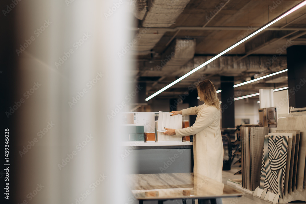 Woman Selecting Tile Samples in a Modern Interior Design Showroom