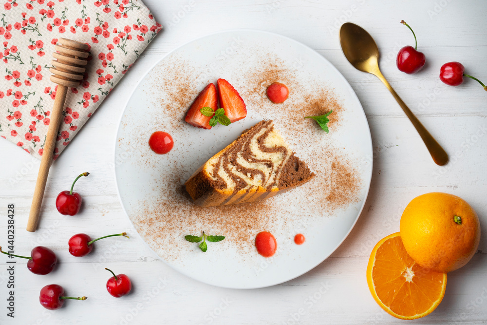 Zebra chocolate cake with decorative lines. Top view table with christmas decorations.