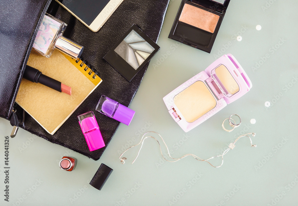 Top view of woman's bag, cosmetic, makeup set, perfume bottle, rings, necklace and smart phone on grey background