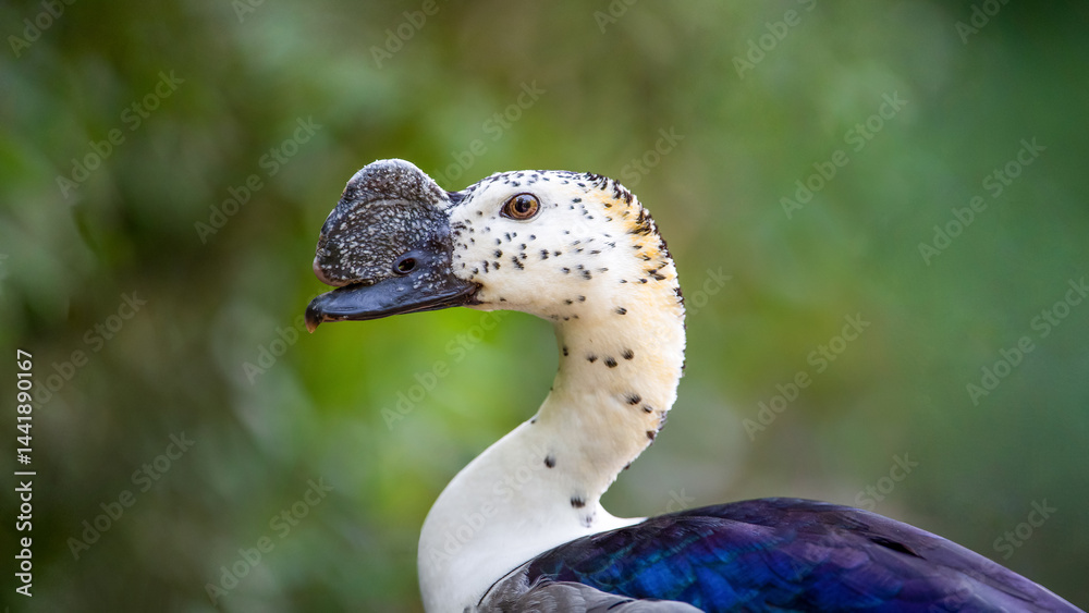 Portrait of a Comb Duck male. Sarkidiornis melanotos, Bioparc, Doué la Fontaine, Doué en Anjou, Maine et Loire 49, Région Pays de la Loire, France, European Union, Europe