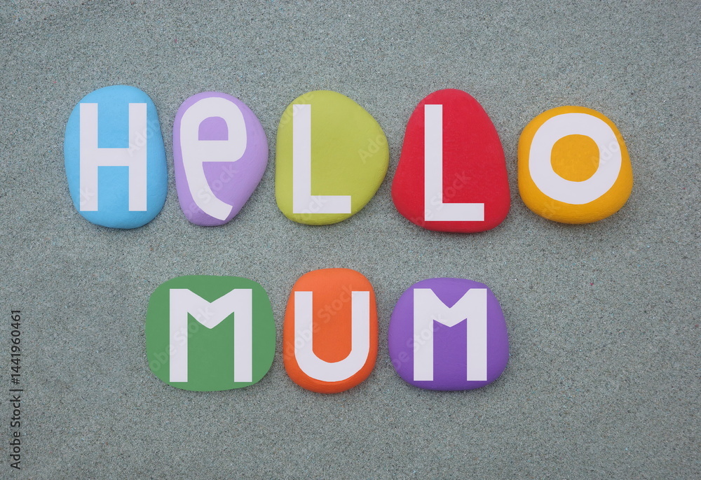 Hello Mum, creative and lovely message composed with multi colored hand painted stone letters over green sand
