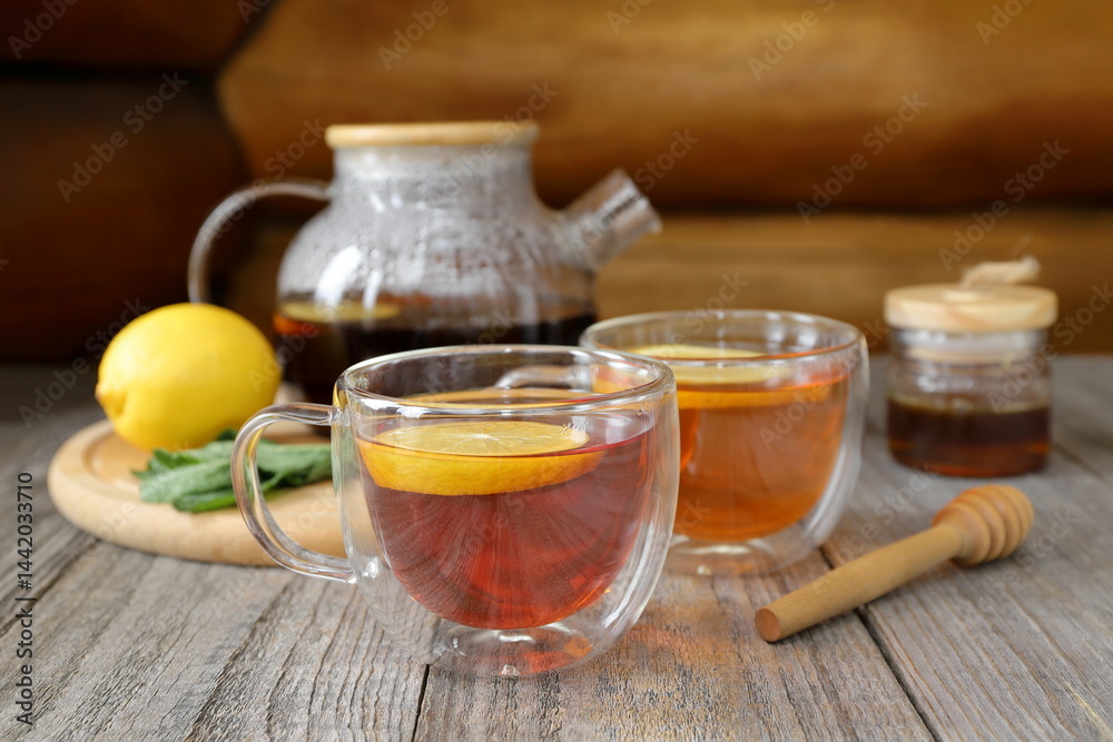 On an old wooden table against a log wall, in front of a tray with a glass teapot, lemon, mint and a glass jar of honey, there are two glass cups of hot black tea.