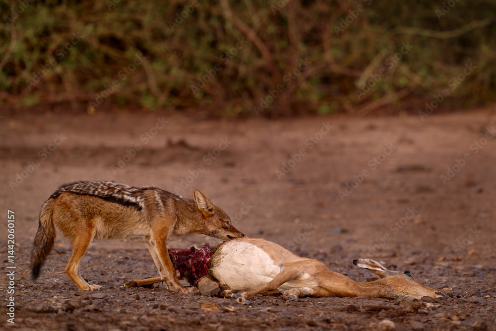 Jackal with implala antelope carcass. Leopard kill from night, eagle bird feeding on antelope in wild nature, Chobe River in Botswana in Africa. Nature wildlife. Black-Backed Jackal in nature.