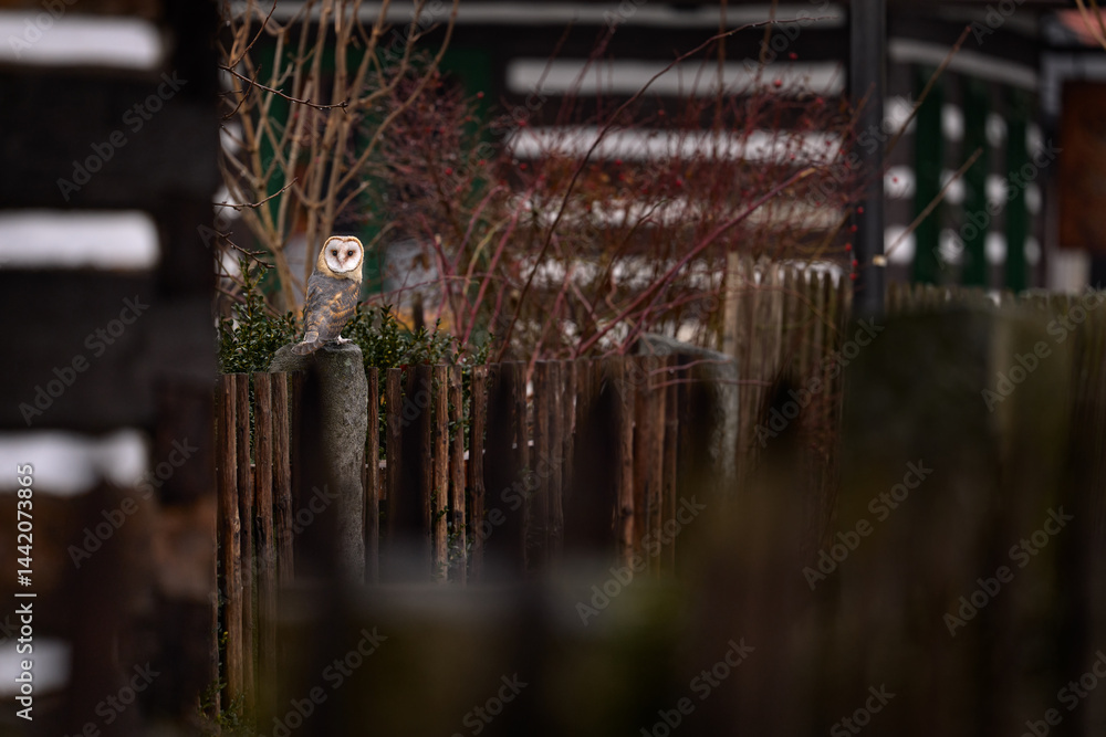 Barn owl in house window in front of country cottage, bird in urban habitat, wheel barrow on the wall, Czech Republic. Wild winter and snow with wild owl. Urban wildlife scene from nature.