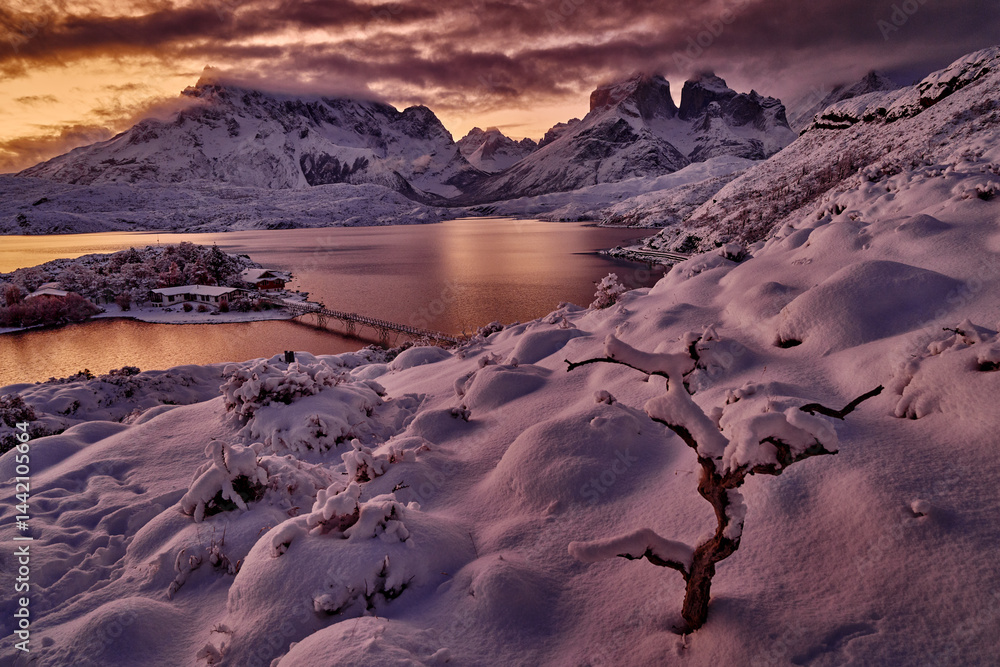 Lake Pehoé in Chile. Winter lanscape from Patagonia moutains with snow. Torres del Paine National Park, Chile. Twilight blue evening sky. Traveling in Chile, hills in Torres del Paine NP.