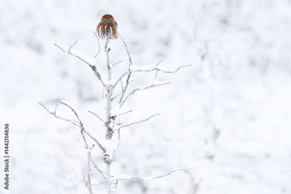 Owl, winter Patagonia. Austral pygmy owl, Glaucidium nana, sitting on the tree branch with clear winter snowy background. Wild bird in the nature habitat, Torres del Paine Chile. Birdwatching America