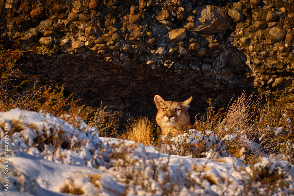Find the wild puma in the nature habitat. Mountain lion in the nature winter mountain rock habitat, Torres del Paine NP in Chile. Wildlife nature in Patagonia, South America. Puma in snow, cold winter