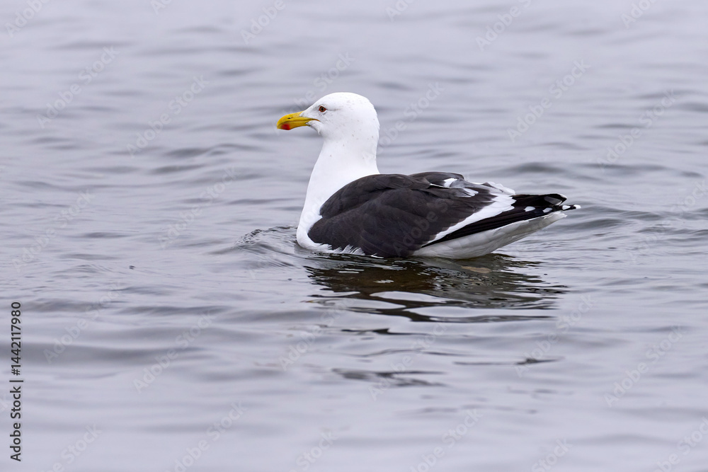 Morning, gull in the water.Slaty-backed Gull, Larus schistisagus, detail bird portrait, winter snowy conditions. Hull with yellow red bill. art view on nature. Close-up bird in the nature habitat, Rau
