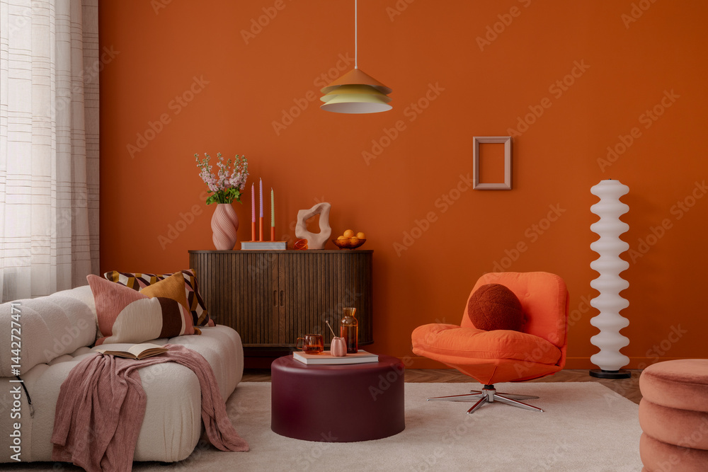 Stylish and cozy interior with white sofa, orange armchair, and sculptural decor on a wooden cabinet. Retro meets playful.