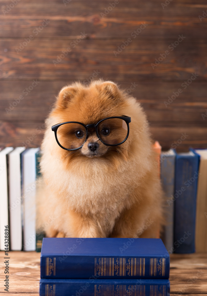 Clever pomeranian dog with a book. A dog sheltered in a blanket with a book. Serious dog with glasses. Dog in a library