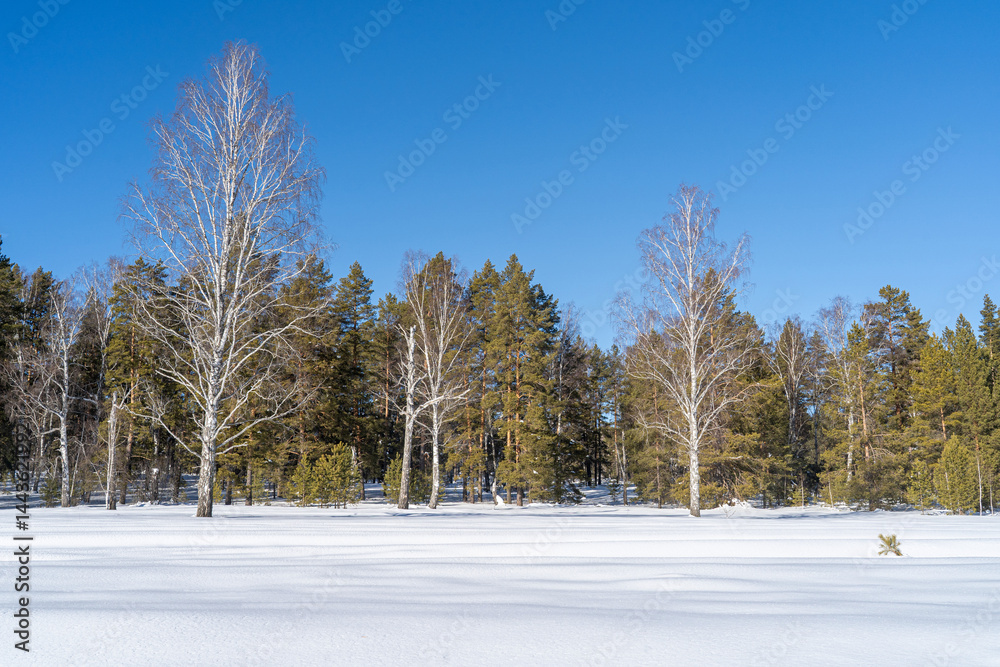 Winter forest on a sunny day. In the foreground is a snow-covered area with a pronounced snow texture.