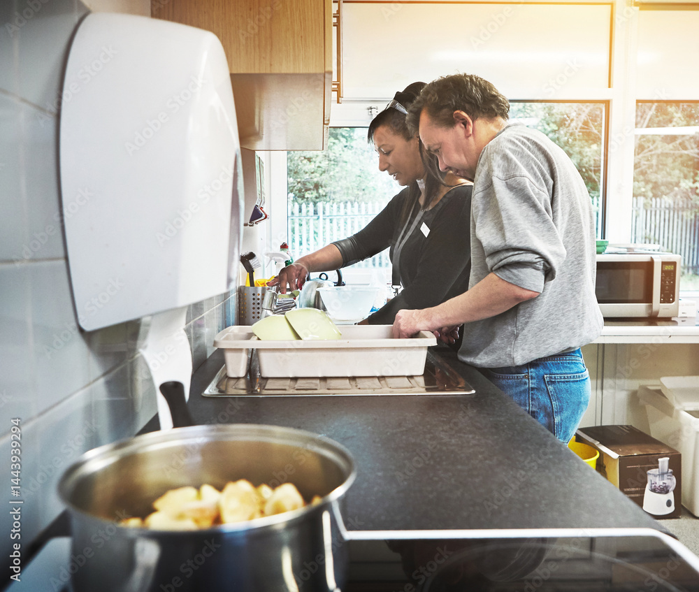 Healthcare kitchen, disabled man learning skill and medical assistant teaching independent motivation. Disability institute awareness, empowerment in cleaning and senior person cooking at table
