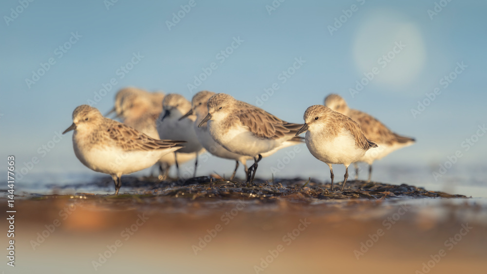 A group of wild red-necked stints (Calidris ruficollis) gathering on a shoreline with seaweed, Australia