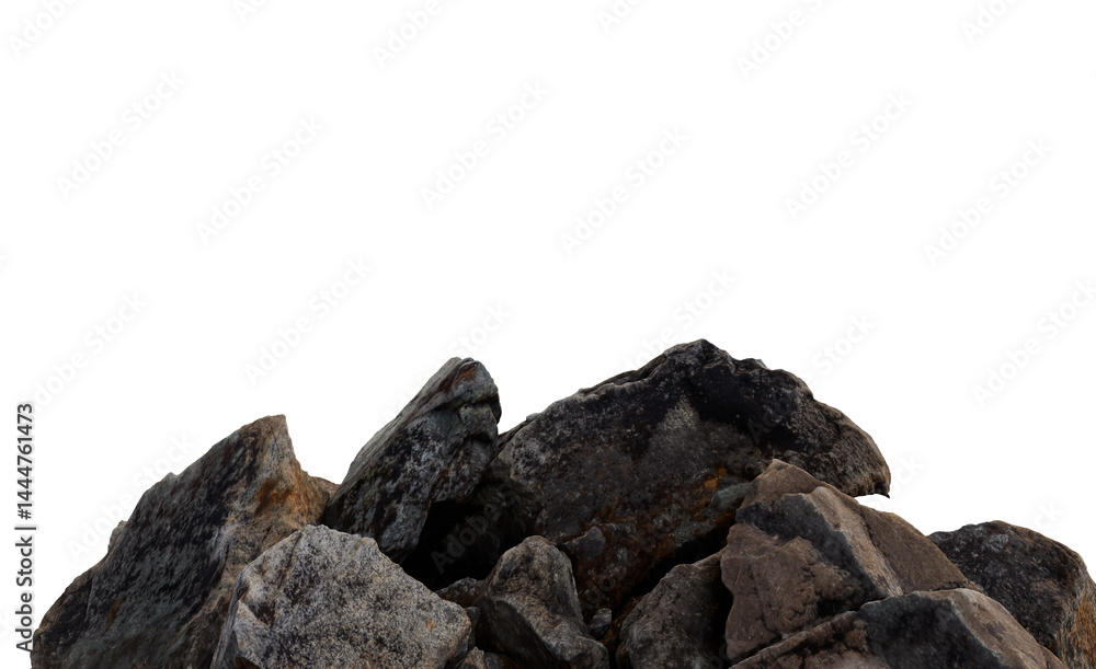 A pile of varied gray and brown rocks, clustered together, with uneven surfaces and textures, against a stark black background