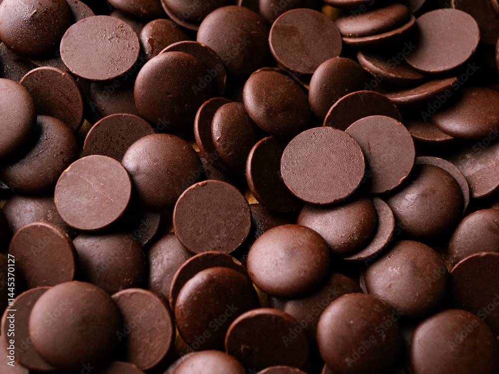 Dark Chocolate COUVERTURE chips Pistols buttons. Confection and pastry concept.