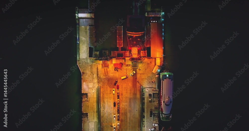 Ferry boat docked at night, cars driving off as a dramatic sunset paints the sky. Lights illuminating the scene reflect on the water, creating a picturesque coastal view
