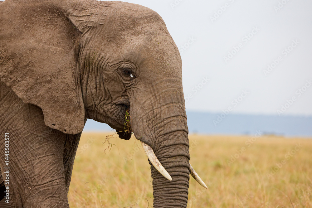 Vertical photo Closeup of African elephant showing tusk, trunk, and eye detail in Masai Mara, Kenya. Wildlife texture and facial features in natural habitat. Safari animal portrait.
