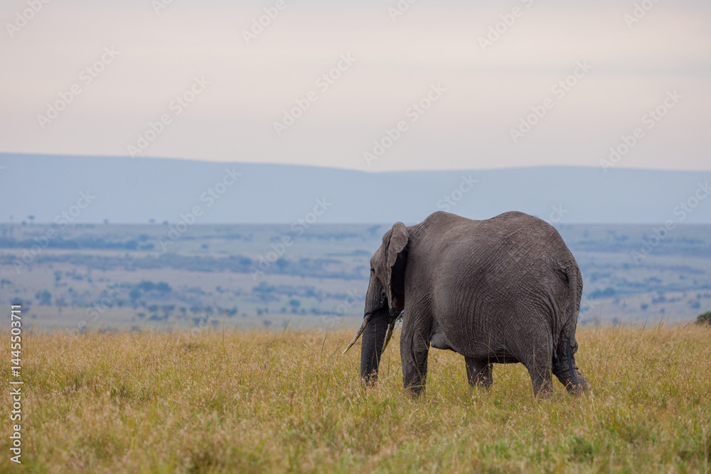 Single African elephant standing in Masai Mara grassland, Kenya. Wildlife safari scene in natural savannah habitat. Lone tusker in the wild.